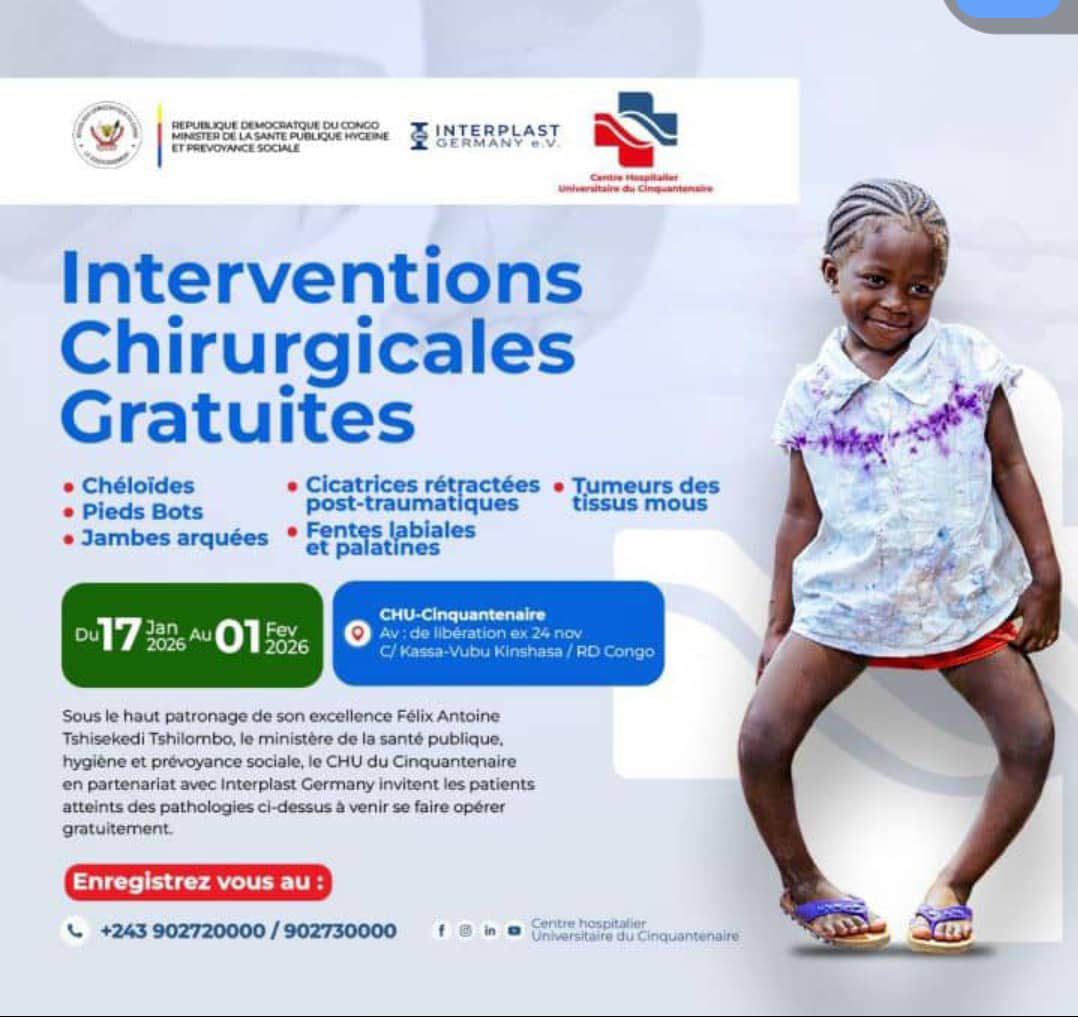 Sous le haut patronage de Son Excellence Félix Antoine Tshisekedi Tshilombo, Président de la République, le ministère de la Santé publique, Hygiène et Prévention sociale, à travers le Centre hospitalier universitaire (CHU) du Cinquantenaire, organise une campagne d’interventions chirurgicales gratuites à Kinshasa.