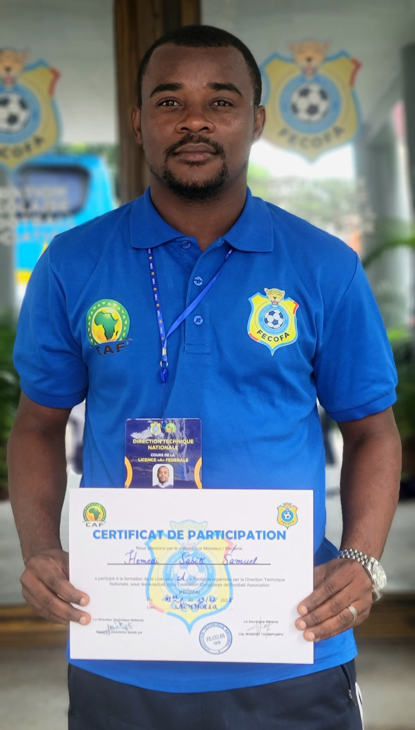 Au-delà de la remise des certificats, la FECOFA, par le biais de sa DTN, rappelle que l’objectif de cette initiative est d’*instaurer une culture de performance, d’éthique et de planification dans le métier d’entraîneur*. Le football congolais, en quête de résultats stables et de structures durables, devra désormais compter sur une base technique solide, animée par des formateurs qualifiés.Signalons que le coach Hemedi SABITI a eu à coacher les clubs de la première division de l’Entente Urbaine de Football de Kisangani ( EUFKIS ): EL Dahee,CS Elikya,SC Okapi et Black City. Et un club de la seconde division de la linafoot AS Nouvelle Espérance. Ce grand homme,Samuel Hemedi est fortement marié et père de trois enfants. Il est licencié en Sciences Politique et Administrative à L’université de Kisangani ( UNIKIS ). Il est le fils du Coach SABITI ancien du Cercle Sportif Makiso.